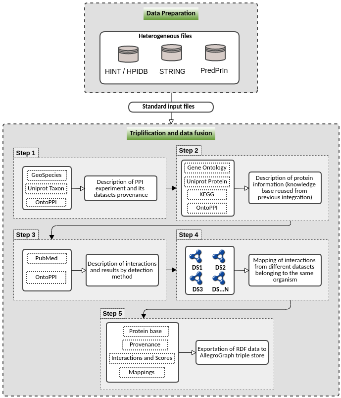 This pipeline has as major goal provide a tool for protein interactions (PPI) prediction data formalization and standardization using the OntoPPI ontology. This pipeline is splitted in two parts: (i) a part to prepare data from three main sources of PPI data (HINT, STRING and PredPrin) and create the standard files to be processed by the next part; (ii) the second part uses the data prepared before to semantically describe using ontologies related to the concepts of this domain. It describes the provenance information of PPI prediction experiments, datasets characteristics, functional annotations of proteins involved in the PPIs, description of the PPI detection methods (also named as evidence) used in the experiment, and the prediction score obtained by each PPI detection method for the PPIs. This pipeline also execute data fusion to map the same protein pairs from different data sources and, finally, it creates a database of all these information in the alegro graph triplestore.
