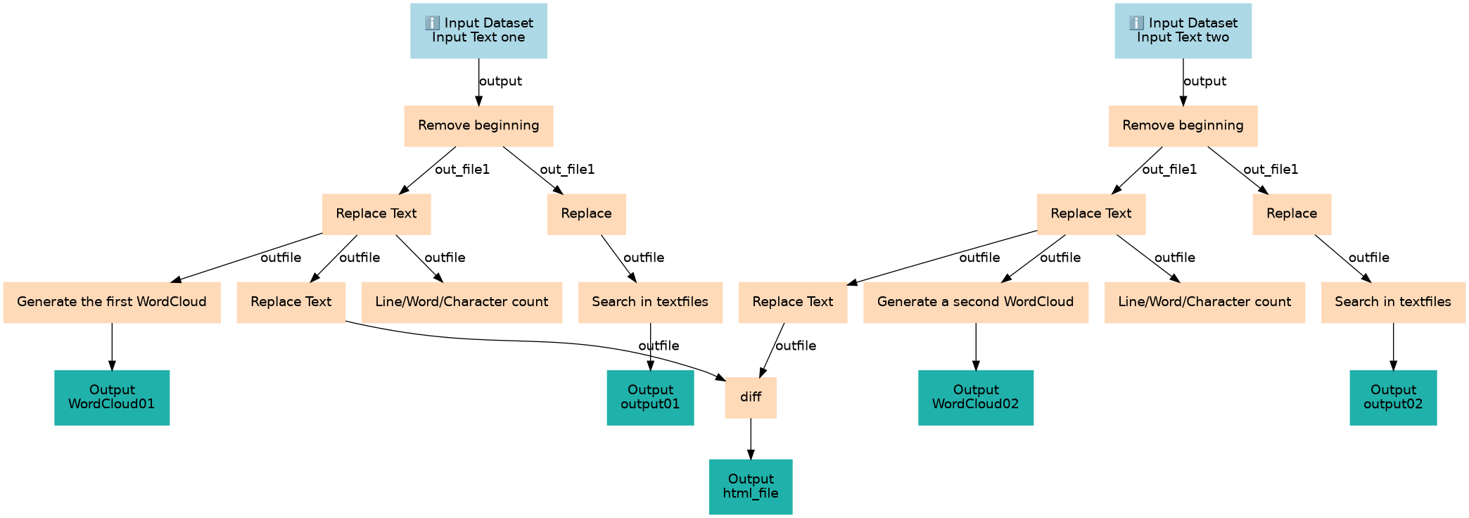 The workflow serves as a short introduction to Galaxy for users from the Humanities who mostly work with texts. The workflow compares two texts, visualises the differences with 'diff' and a wordcloud and extracts selected passaged for further analysis.